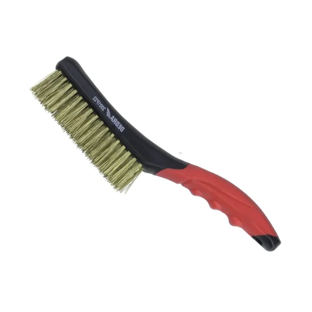 Steel or brass bristles, wooden or plastic handle, 10–14 inches for cleaning surfaces.